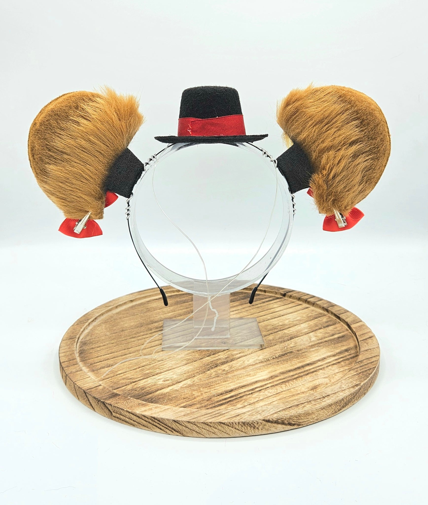 3.5" Toy Freddy inspired bear *PRE ORDER* slot. PLEASE BE AWARE THIS IS NOT A READY TO SHIP ITEM!! PRODUCTION TIME WILL BE 6-18 WEEKS! DO NOT PURCHASE IF YOU NEED THESE URGENTLY! Made using high-quality tan and light brown faux fur. Airbrushed using light brown and light orange coloring. Felt top hat with red trim. Hat is worn via clear elastic band. Detachable mini red bow set. Fully wired, preposed, and posable. Attached to metal headband and position can be adjusted. Ears are handmade so minor flaws can be expected 💕 No refunds! By purchasing you agree to my ToS.